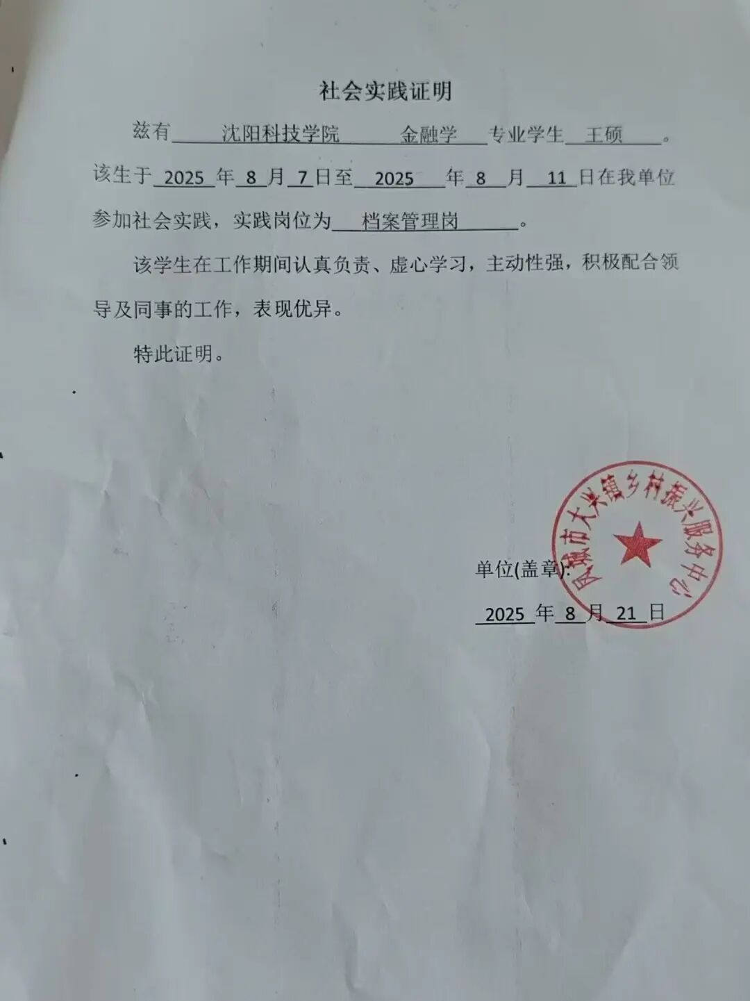 实践感悟:通过这次实习,我不仅加深了对国家治理体系的理解,也提升了自身的沟通能力和组织协调能力。同时,我深刻认识到基层工作的重要性,更加坚定了服务家乡、服务社会的信念。作为一名金融学专业的员工,我意识到金融知识在基层经济发展中的重要作用,未来我将更加努力学习专业知识,为乡村振兴贡献自己的力量。