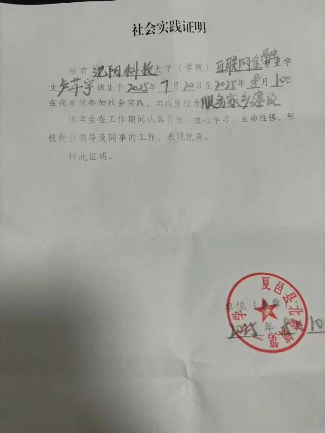 实践感悟:本次“岗位实习”实践活动取得了显著成效,我们在实践中增长了见识,提高了能力,增强了社会责任感。同时,活动也为家乡的发展提供了有益的参考和支持。未来,我们将继续坚持此类活动,不断创新实践活动形式和内容,多多去寻找实践机会和发展空间,努力让自己成为有理想、有本领、有担当的时代新人。