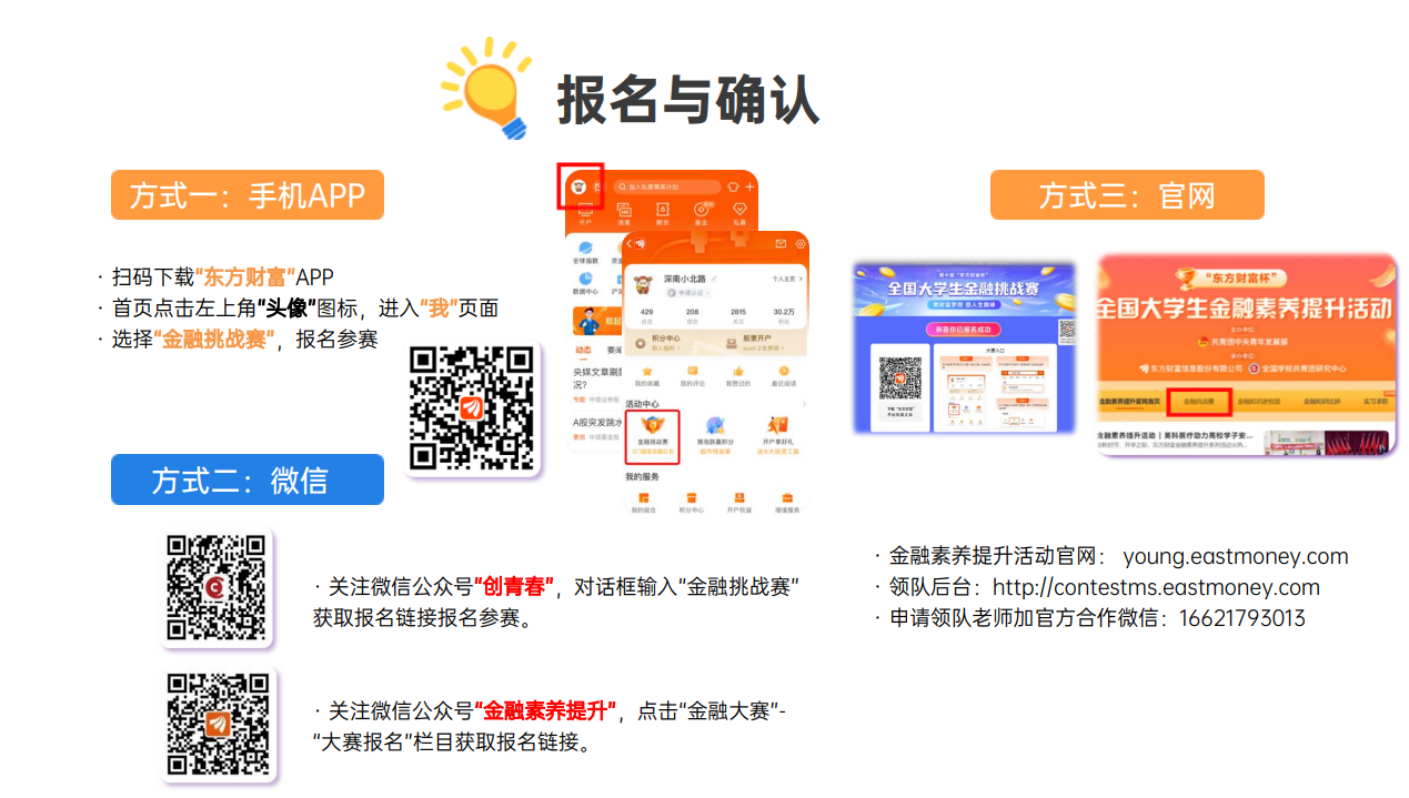在大赛官网点击“金融挑战赛”进入报名界面。大赛官网:https://young.eastmoney.com