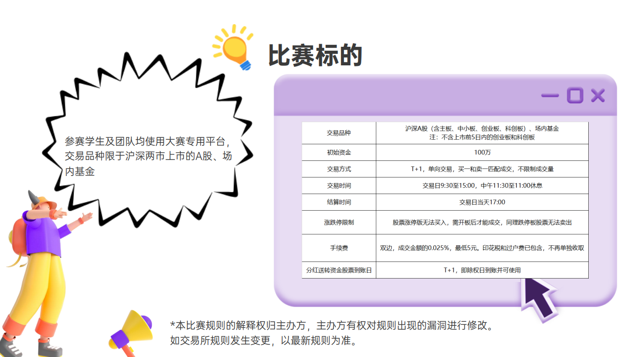 参赛者在比赛期间需至少完成一次模拟交易,否则视为无效参赛,不参与最终排名。