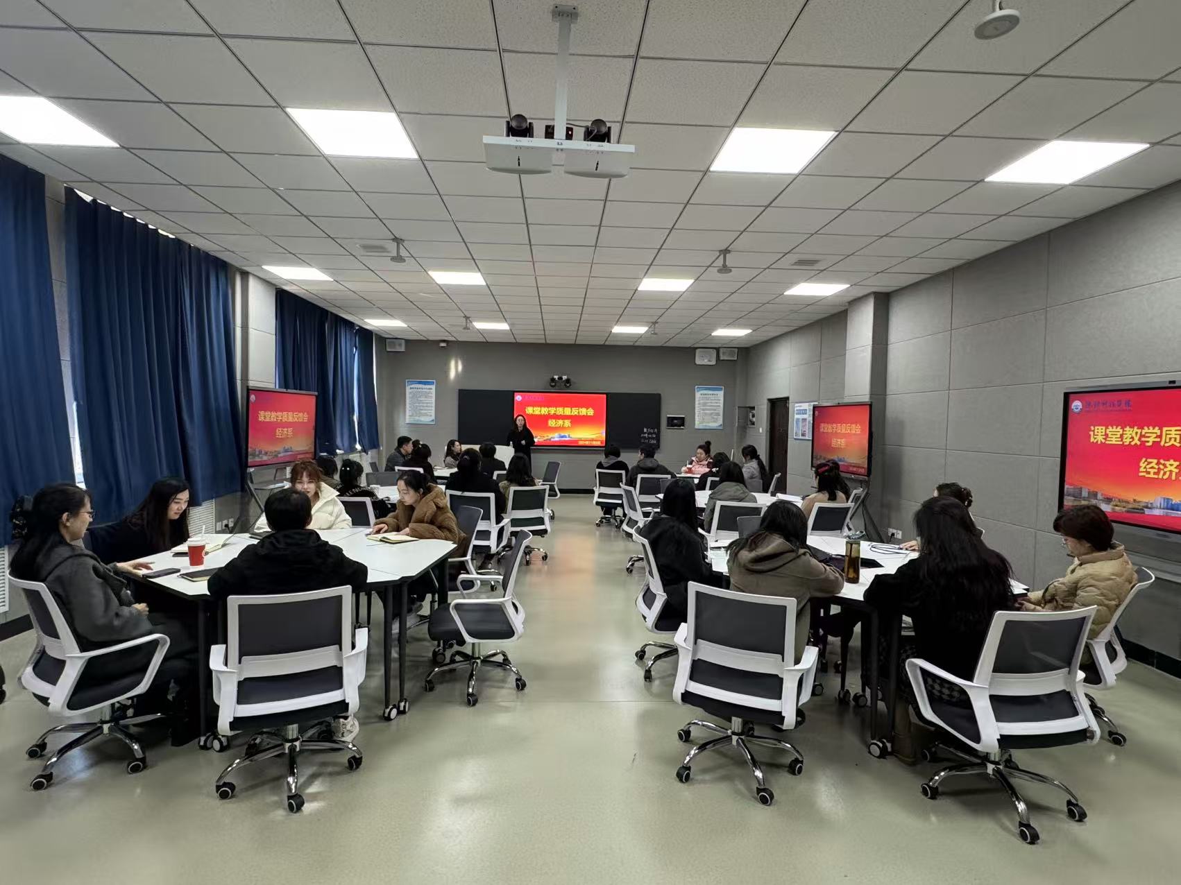 为加强课堂教学质量监控,切实提高教师教学水平,11月6日下午,经济系在第二教学楼智慧教室召开了课堂教学质量反馈会,副董事长张丽影,经济系主任管迪,教学主任李贺,校级教学督导岳玉珠及我系全体教师参加了本次会议,会议由李贺主持. 会议开始,李贺主任总结上周公司召开的“EMC易倍官网课堂教学质量反馈交流会”中,各位专家督导提出的典型问题,向教师们传达了校领导对提升课堂教学质量所提出的各项具体要求......